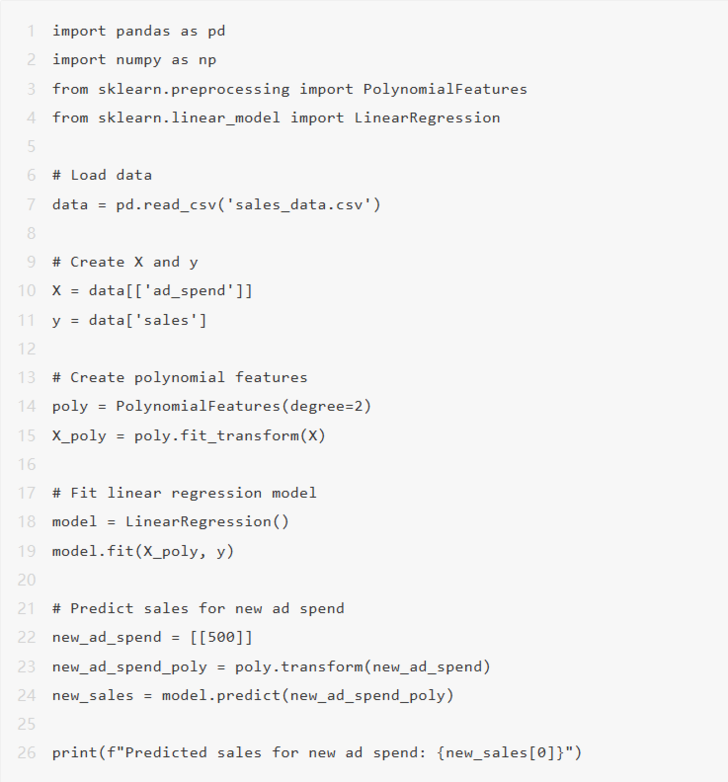 在上面的程式碼中,我們使用了Pandas庫來載入資料,並將廣告費用和銷售量分別儲存在X和y中。然後,我們建立一個PolynomialFeatures物件,將X轉換為二次多項式特徵,並將結果儲存在X_poly中。接下來,我們使用LinearRegression類來訓練模型,並使用predict()方法預測新的銷售量。