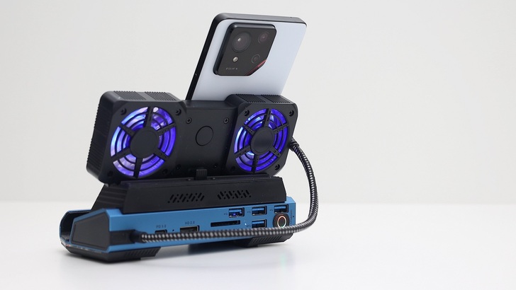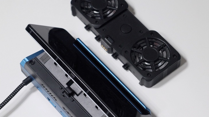 而且上面還兩顆風扇可以幫忙散熱,相較 noda 上一代底座的風扇聲音也下降不少。對長時間擺放掌機、手機來說,就不用擔心外部散熱的問題。當然 ROG Phone 不像掌機那麼大台,所以會看到風扇高出機身一節,但你也可以選擇直立擺放。如果是覺得風扇大聲,也可以選擇關閉風扇或將其卸除,沒錯!那個風扇模組是可以拆下的。