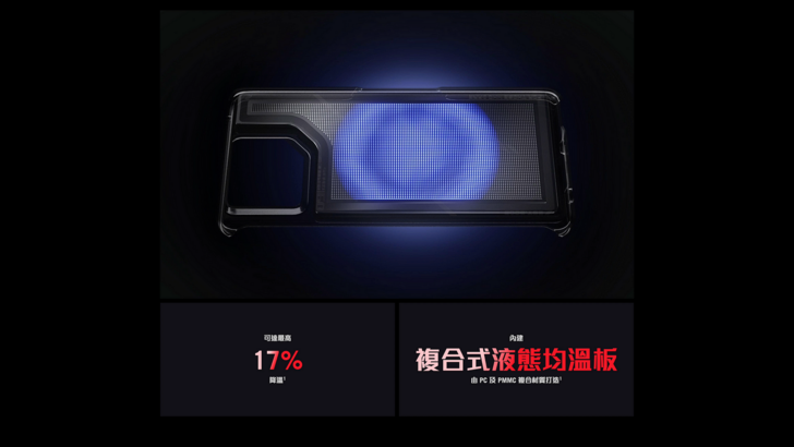 華碩介紹時還以「穿比不穿還涼」來形容。據稱中間是液態均熱板,的確是有液體在裡面,類似塔散的熱管一樣,再透過毛細現象回來。華碩說困難點在於材料的使用,如官網提到「由 PC 及 PMMC 複合材質打造」。不過官網的介紹還是滿玄的,就是這個「最高可達 17% 降溫」。