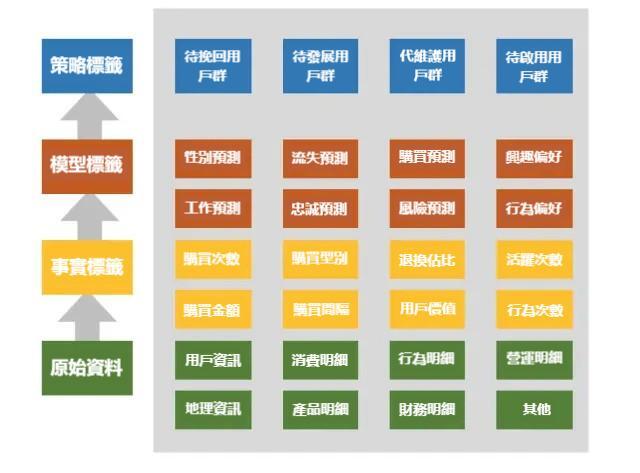 定性的方法,表現為對產品、行為、使用者個體的性質和特徵作出概括,形成對應的產品標籤、行為標籤、使用者標籤。