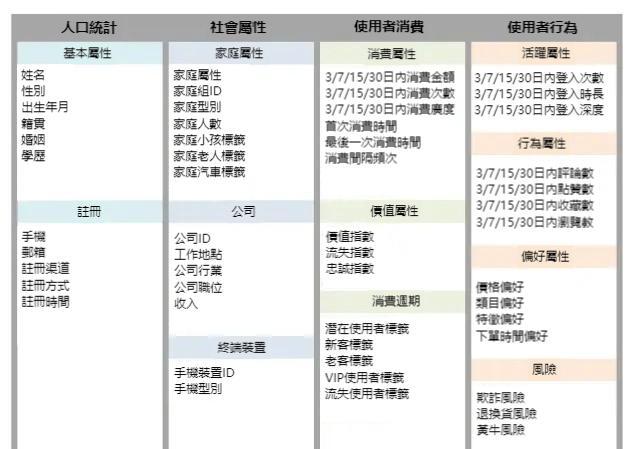 使用者畫像一般按業務屬性劃分多個類別模組。除了常見的人口統計,社會屬性外。還有使用者消費畫像,使用者行為畫像,使用者興趣畫像等。具體的畫像得看產品形態,像金融領域,還會有風險畫像,包括徵信、違約、洗錢、還款能力、保險黑名單等。電商領域會有商品的類目偏好、品類偏好、品牌偏好,不一而足。