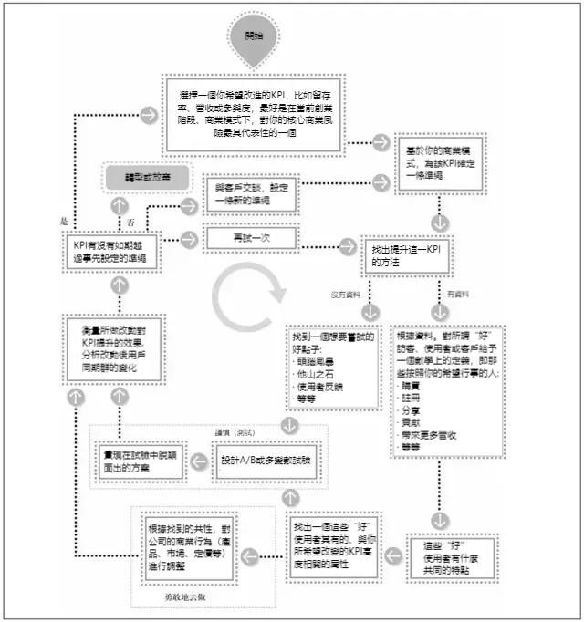 精益資料分析的核心在於如何找到一個有意義的指標,然後透過試驗改善它,直到令你滿意;之後,轉而解決下一個問題,或步入創業的下一個階段。整個週期如圖