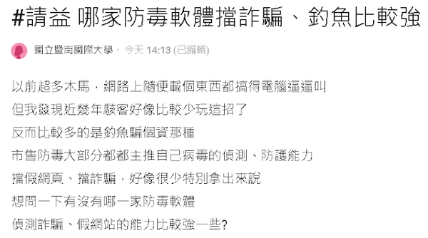 ▲ DCARD網友問到哪家]防毒軟體擋詐騙、釣魚比較強?