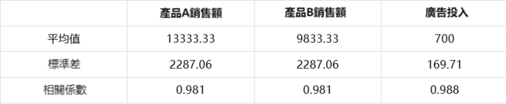 3.計算產品A銷售額和廣告投入、產品B銷售額和廣告投入之間的皮爾森積動差相關係數。