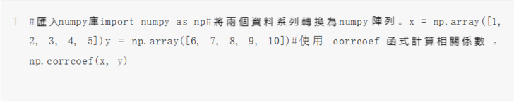 這將返回一個 2x2 的陣列,其中第一行第二列和第二行第一列的值就是相關係數。