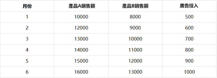 我們以一個銷售業務場景為例來介紹相關性分析的應用。假設某家公司銷售兩種產品:A和B,每月的銷售額和廣告投入如下表所示: