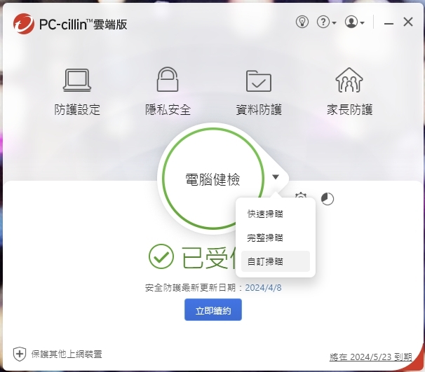 ▼ PC-cillin 首頁的介面,中間有個小箭頭 點下去,會有選項選擇 自訂掃瞄 就可以選取要掃描的 硬碟槽,直接把主系統槽打勾。