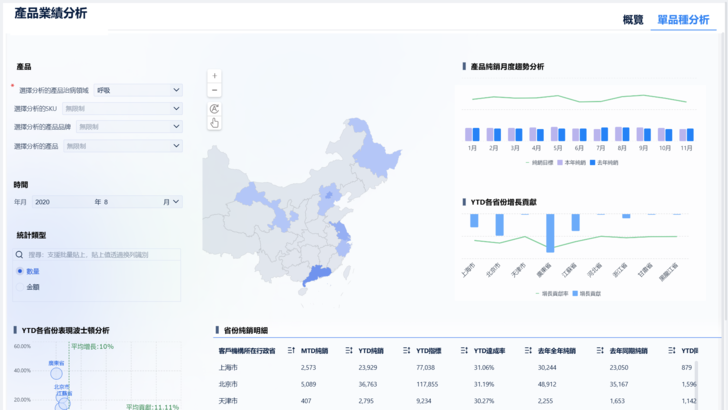 在「概覽」頁面,您可以快速了解各產品的銷售情況;若需要進一步對某一品類進行分析,可以進入「單品種分析」模式,深入瞭解具體產品的區域銷售表現,從而更好地制定銷售策略。指標包括: