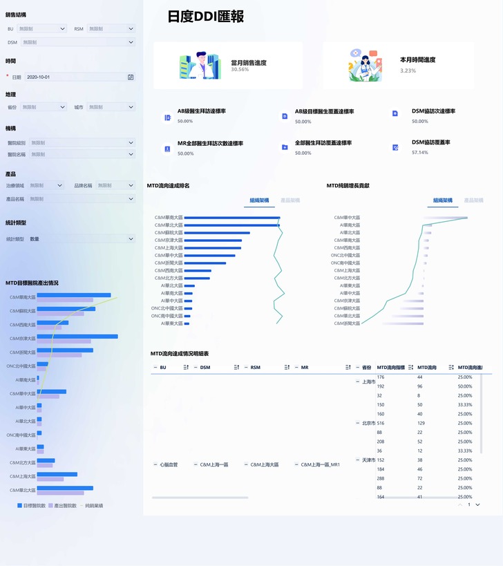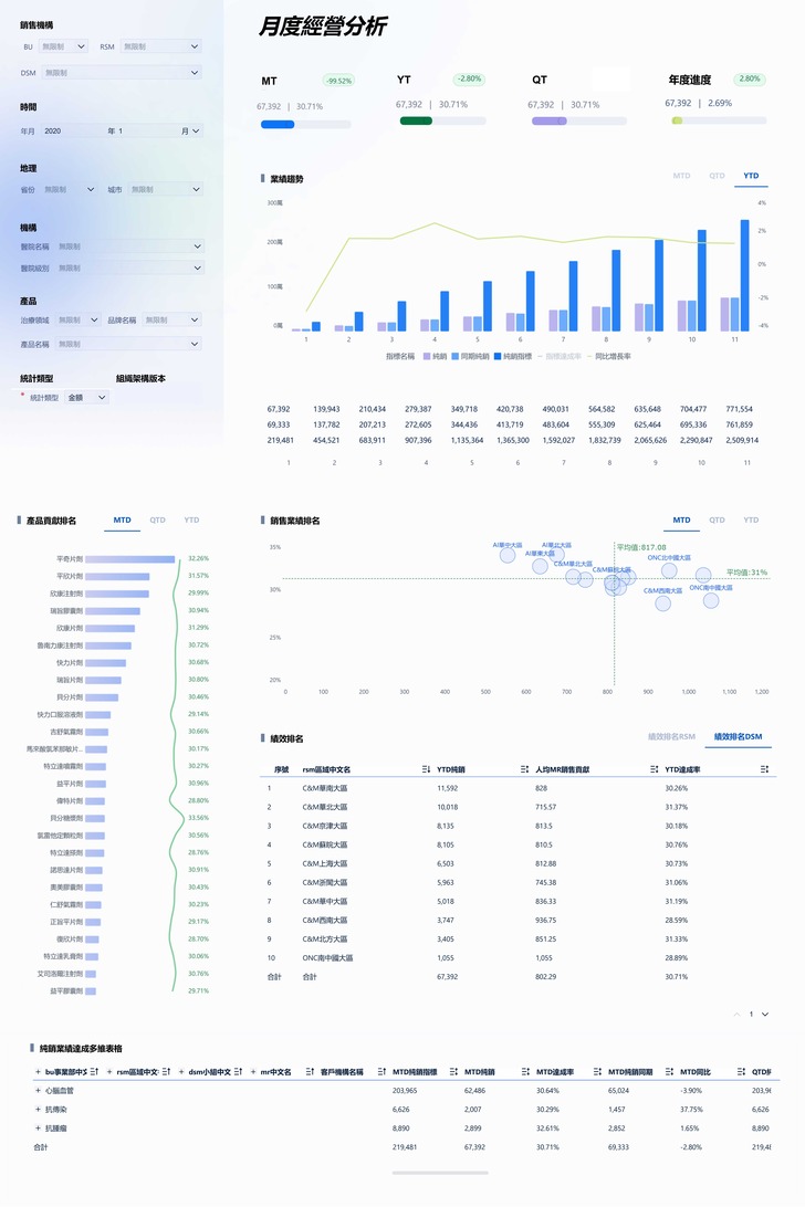 ● 績效排名:區域、年度至今(YTD)純銷、人均MR銷售貢獻、YTD達成率