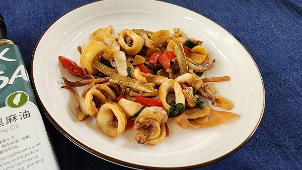 4.加入中卷和醬汁翻炒熟後,加入辣椒和九層塔,繼續炒至收汁
