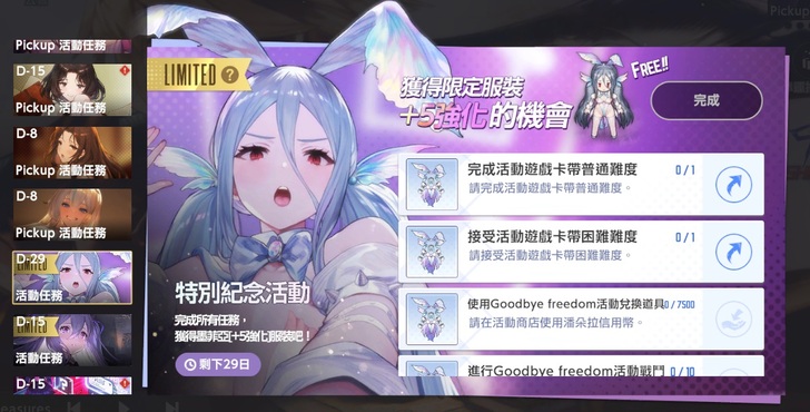 這次最實用的就是兔女郎活動啦!登入就送一隻兔女郎,解任務再拿5隻,簡單輕鬆直接把角色練到滿,就算是困難模式也只要「接到任務」就算過關!