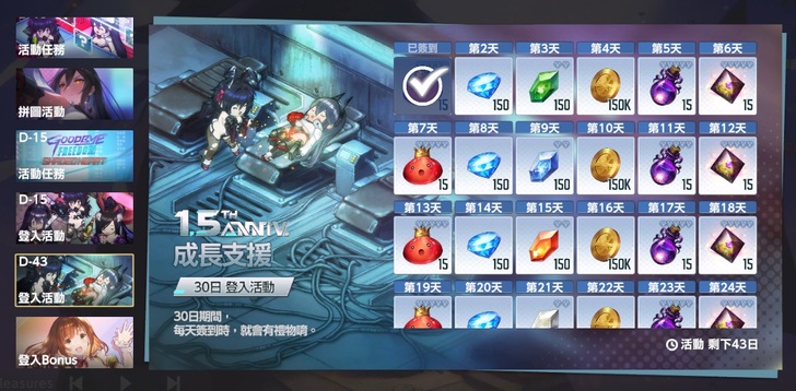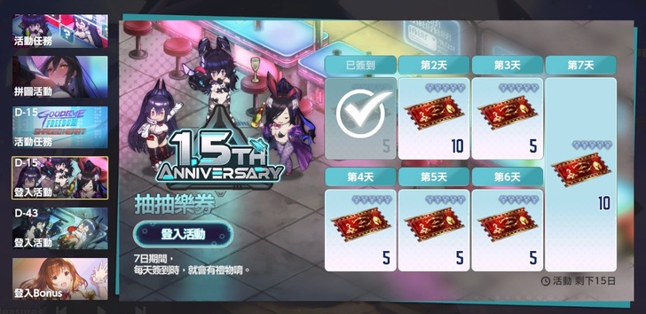 成長材料、角色、抽抽券、鑽石,這次1.5週年活動通通都能拿到,免費500抽輕鬆入手,加上好幾隻超讚的兔女郎服裝設計,光看就心滿意足!趁著這波活動,把所有兔女郎都帶回家吧~