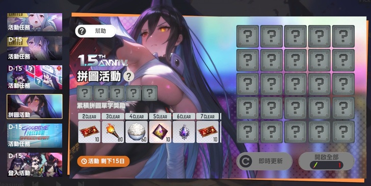 每天花個10分鐘完成每日任務,就能輕鬆玩拼圖,獎勵超豐富20抽和滿滿成長資源,活動時間夠也能開完拼圖所有大小獎!
