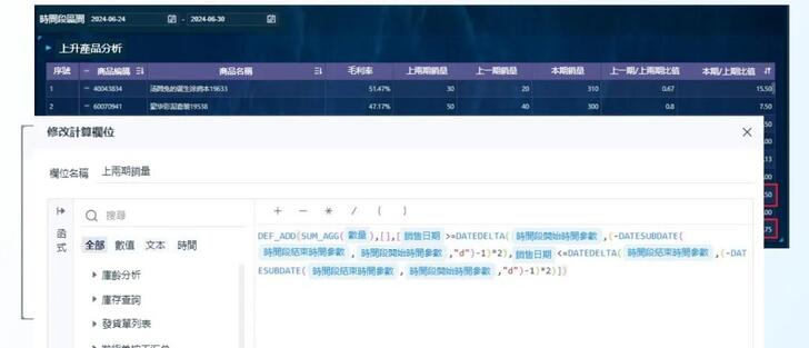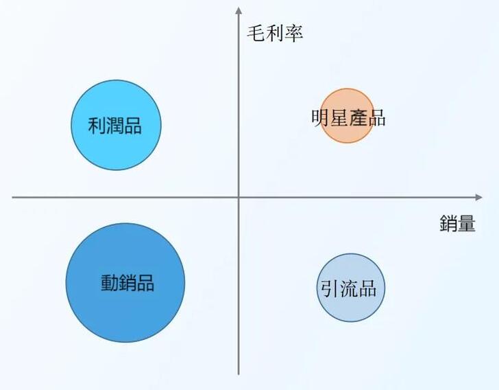 透過7天銷量週期分析,看銷量整體上升情況。監控上升品種、監控毛利率。持續監控上升品的銷量變化,結合毛利率構建四象限圖,為營銷和補貨決策提供支援: