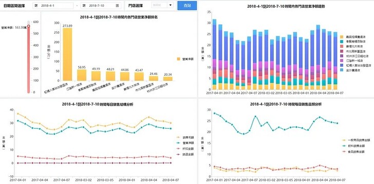 門店經營的綜合數據分析是對營業額、毛額、淨額等數據的總結與分析。透過FineBI,使用儀表盤元件和柱狀圖,對各門店的營業額進行詳細統計,並對不同品類的銷售結構進行折線圖分析,便於管理層了解銷售情況,及時調整經營策略。