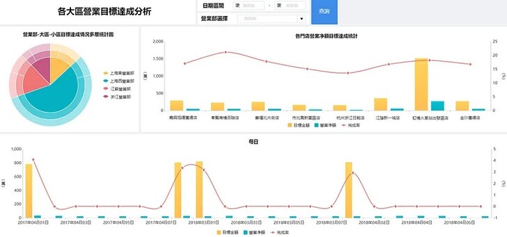 對於每個門店的經營目標達成情況,FineBI能夠生成層次分明的目標達成分析報告。通過多層次的餅圖和組合圖,門店管理者可以清晰地看到每個門店的目標完成度,從而為後續調整經營策略提供數據支持。