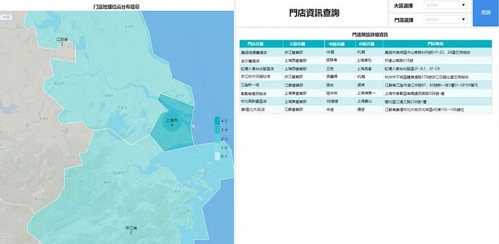 FineBI內建的地圖元件可以幫助門店管理層對地理位置數據進行可視化展示,從而快速查詢門店的相關資訊,便於決策者迅速掌握全局。