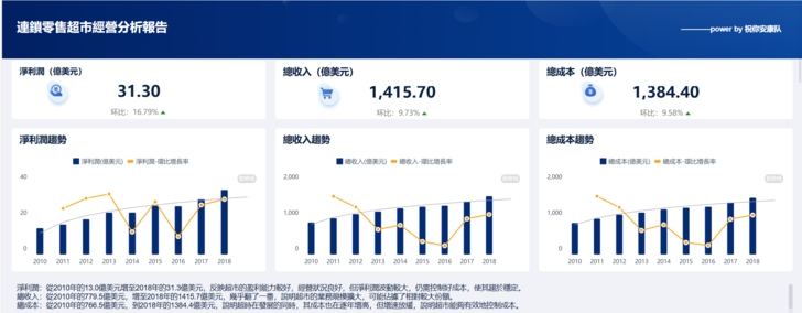 在完成了資料的處理之後,我們將核心的三個指標,也就是利潤、收入和成本的增率與原始資料相結合,用於指標卡的製作,並在組合圖的製作時,往後推了一個週期進行預測,展示超市最新一年的成績以及在過去幾年中的發展趨勢。