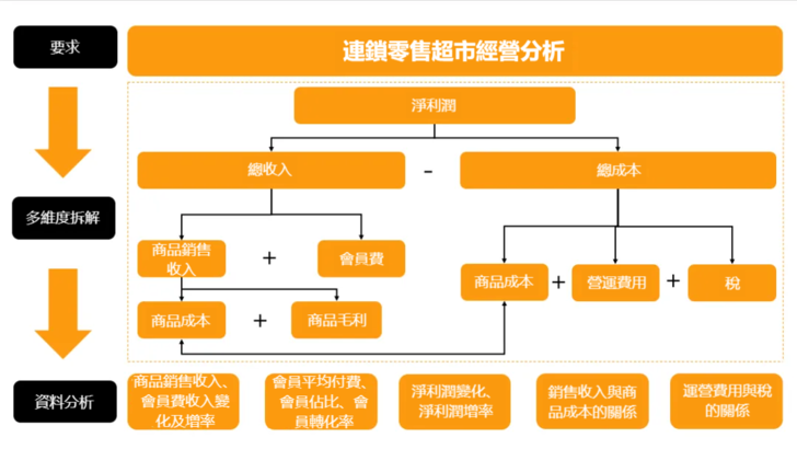 首先是淨利潤本身,透過對比不同年份的資料,對公司的整體情況進行評價,瞭解企業的發展趨勢和變化。而淨利潤=收入-成本,我們再對收入、成本進行多維度的分析,在分析收入的過程中,還對會員資料進行了分析,層層拆解以分析超市的整體盈虧情況,如下圖所示。