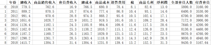 ● 會員費收入雖然僅佔比2%,比例並不高,也並非可以忽視,雖然不是總收入的較大貢獻角色,但與商品銷售保持幾乎相同的增長趨勢,未來應該著重於提高會員消費力度,以增加會員費收入;