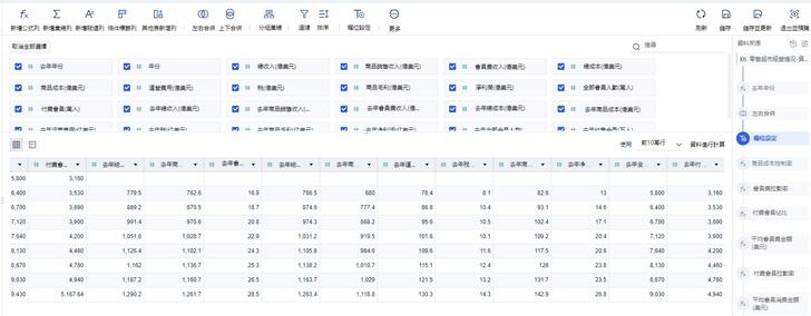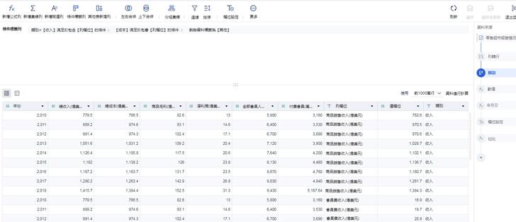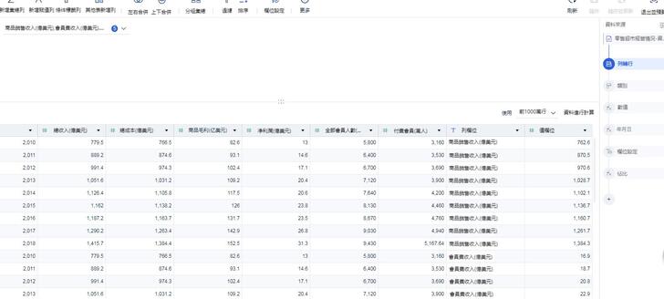 涉及到總收入的資料分別是會員費收入、商品銷售,對於分類的展示需要再新建一個數據集,我們使用了FineBI6.0的新功能列轉行,發現把對應欄位名字放到列欄位了,並分別給出對應的數值。