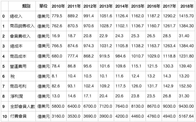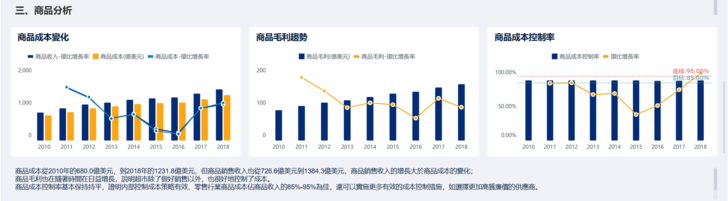 ● 商品成本從2010年的680.0億美元,到2018年的1231.8億美元,但商品銷售收入也從726.6億美元到1384.3億美元,商品銷售收入的增長大於商品成本的變化;