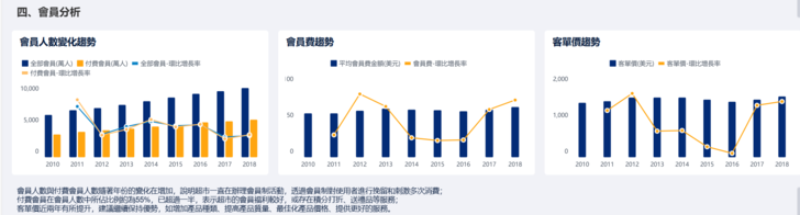 ● 會員分析:分析全部會員人數和付費會員數的趨勢,以及會員費及客單價的情況,瞭解會員結構和貢獻比例。