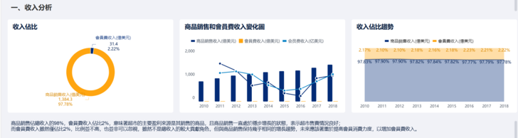 ● 收入分析:比較總收入、商品銷售收入和會員費收入的趨勢和佔比,瞭解各類收入的變化情況和貢獻比例。
