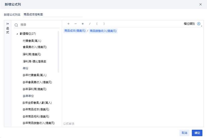 讓我們回到一開始做的經營分析資料寬表。我們為商品分析增加一些計算指標,作為零售企業,商品的分析尤為重要,商品成本控制很大程度上代表了我們的利潤空間,於是我們用商品成本/商品銷售收入計算商品成本控制率。