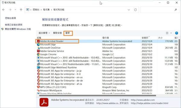 2.將開啟“程式和功能”視窗。選擇電腦上安裝的 Acrobat Reader 版本,然後按一下「變更」選項。