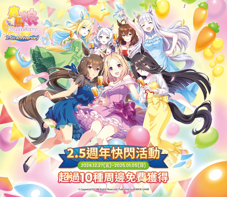 歡迎所有訓練員與我們一同慶祝《賽馬娘Pretty Derby》繁體中文版2.5週年,讓我們一起創造更多美好回憶!立即登入《賽馬娘Pretty Derby》享受週年活動的豪華內容,並蒞臨松山文創園區參與主題遊樂場的多重挑戰!詳情請參考官方公告,與我們一同共享這場盛大的週年慶典!