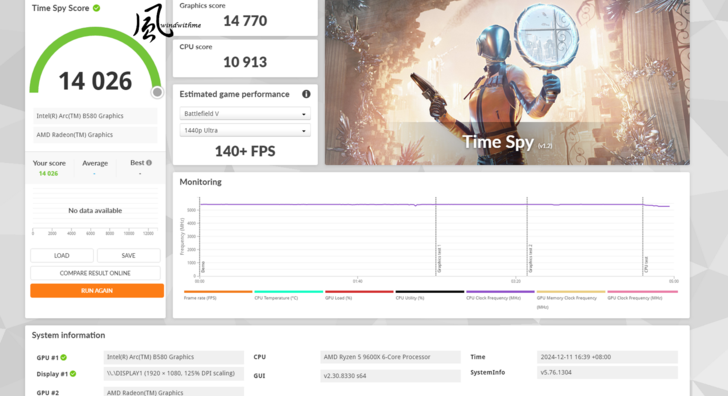 雖然3DMARK中B580在XeSS 1.3.1設定同樣Performance選項的增幅沒有DLSS 3高,改選Ultra Performance就能有相近的效能,未來若支援XeSS 2應該還有提升空間。