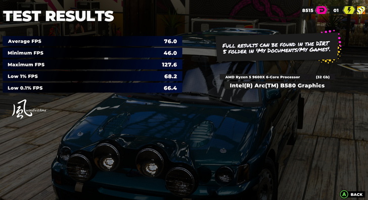 B580 => Average 76.0、Minimum 46.0、Maximum 127.6、Low 1% 68.2;
