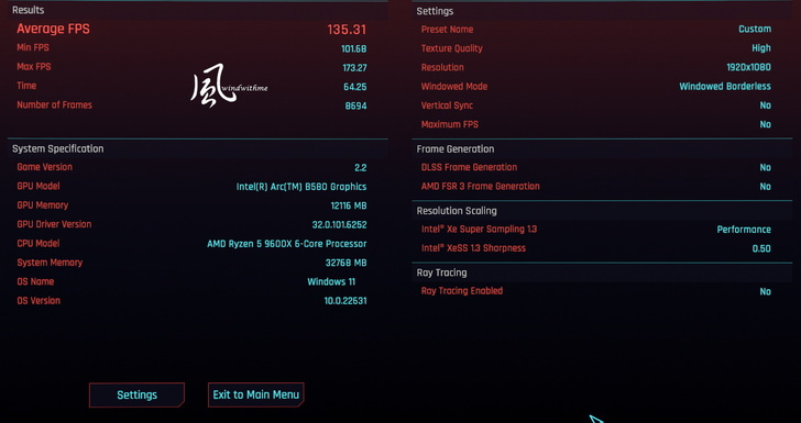 B580 XeSS Performance => Average FPS 135.31、Number of Frames 8694;