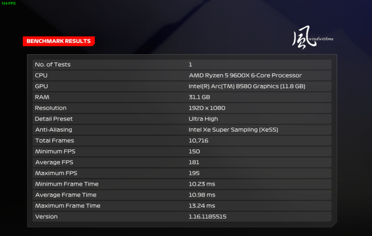 B580 XeSS Ultra Performance、XeSS FG on => Total Frames 10716、Minimum 150、Average 181、Maximum 195;