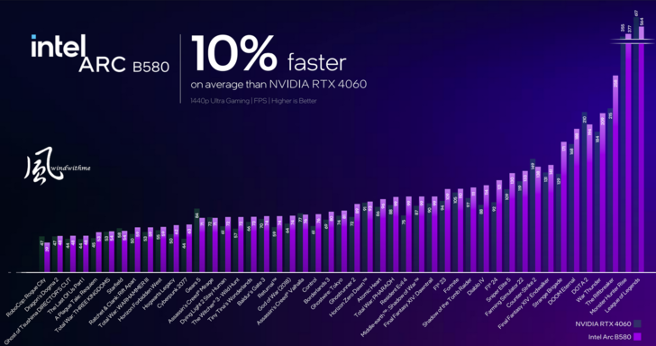 在網路上Intel官方對照圖表可看出B580在1440p對上4060的表現,在許多遊戲都有著不錯的幀數。