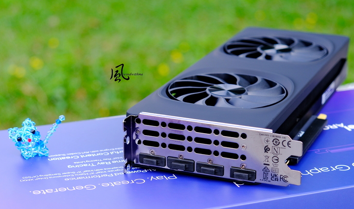 側邊供電為單8Pin,旁邊intel ARC使用時為白色燈號,這次側面與風扇外圍運用更多曲線變化,風扇內建低負載的停轉技術。