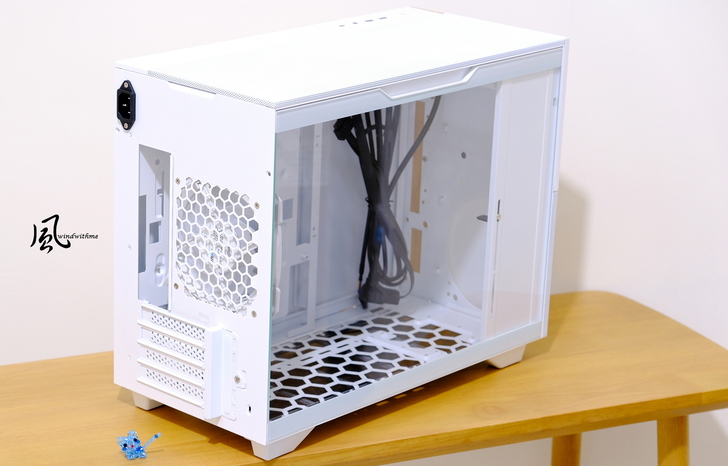 側邊採用免螺絲拆裝的強化玻璃側板,尺寸長寬高為460 x 215 x 359mm,優點是小體積機殼更便於放置於使用環境中,透過設計能將機殼內部有限空間達到更好的利用率,在拆裝側板時卡榫略緊需較費力,不過也讓穩定度較高。