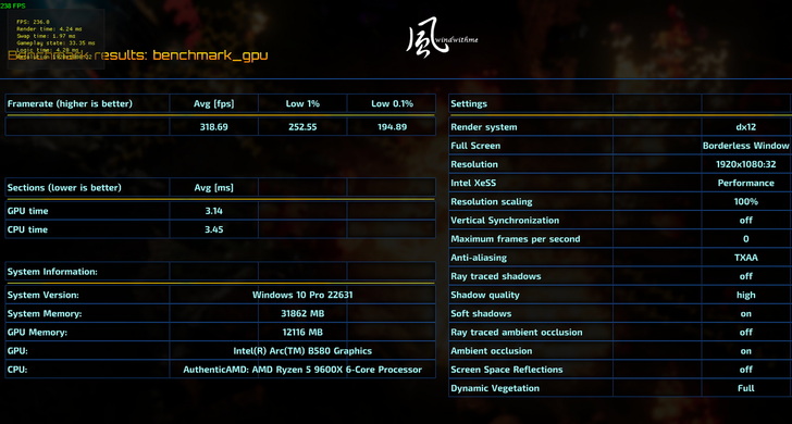 B580 XeSS Performance => Avg 318.69、Low 1% 252.55;