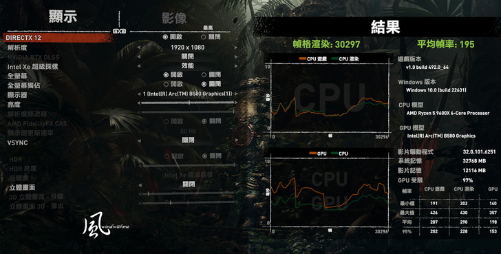 B580 XeSS效能=> 幀格渲染:30297、平均幀率:195;