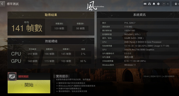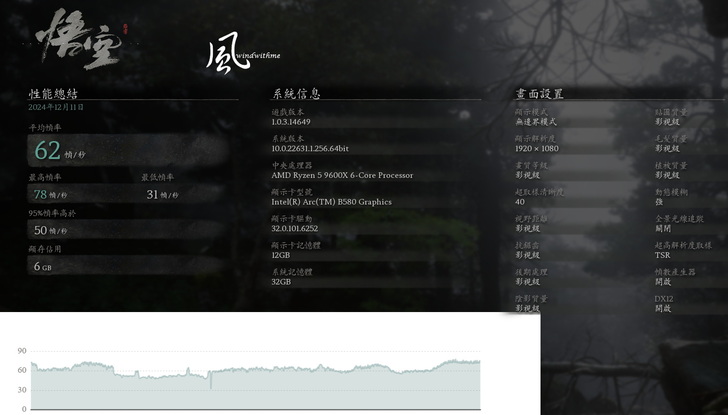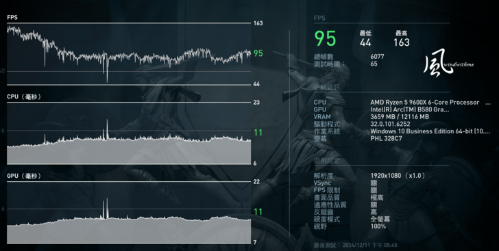 B580 => 95 FPS、最低44、最高163、總幀數6077;