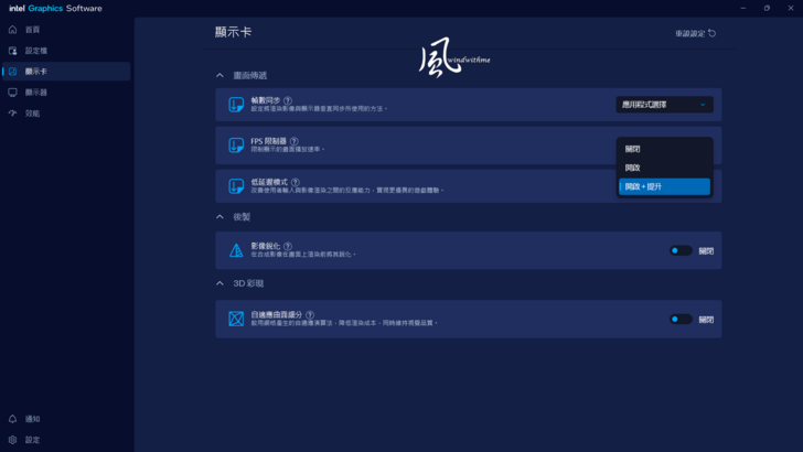 顯示卡頁面提供幀數同步、FPS限制器、低延遲模式、影像銳化、自適應曲面細分。