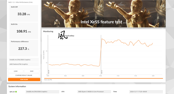 B580 =>XeSS off 33.28 FPS、XeSS Ultra Performance on 108.91 FPS、Performance difference 227.3%。