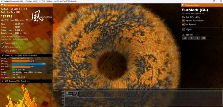 B580雙風扇=>127 FPS、溫度63、整機耗電量268W;