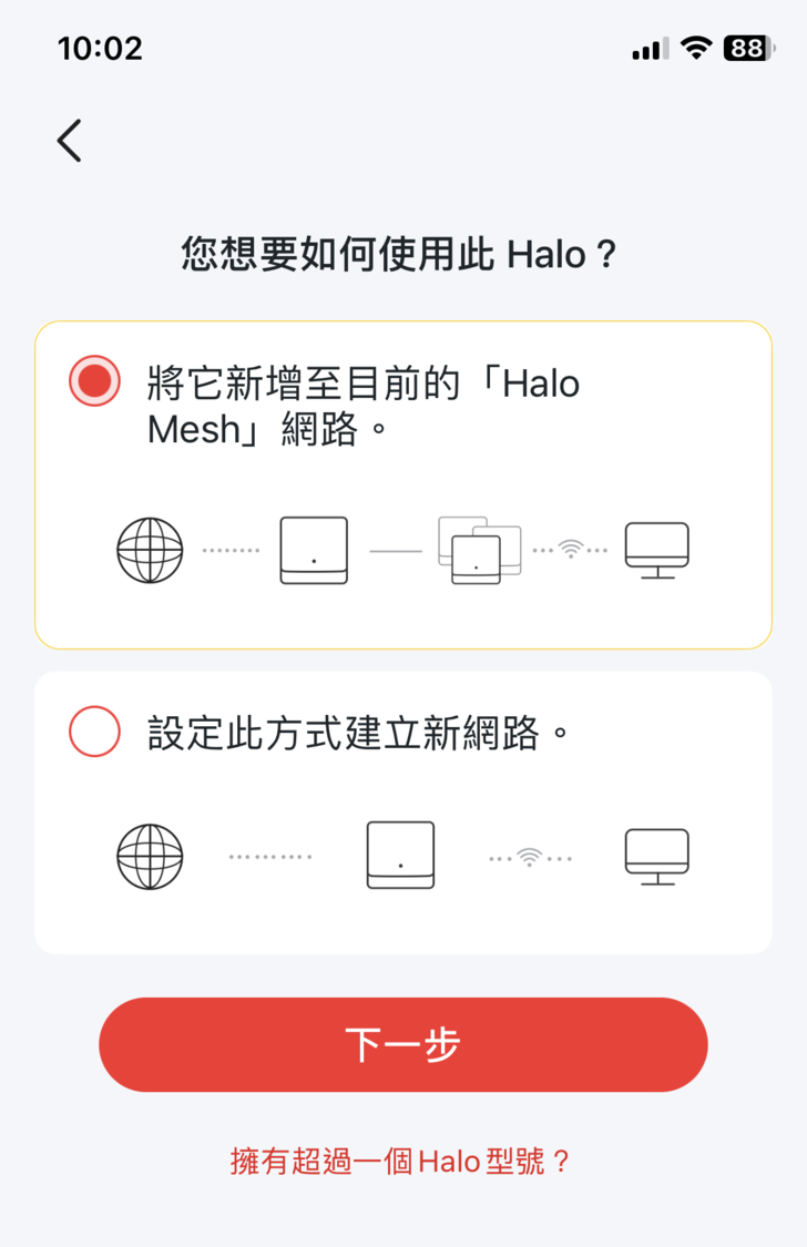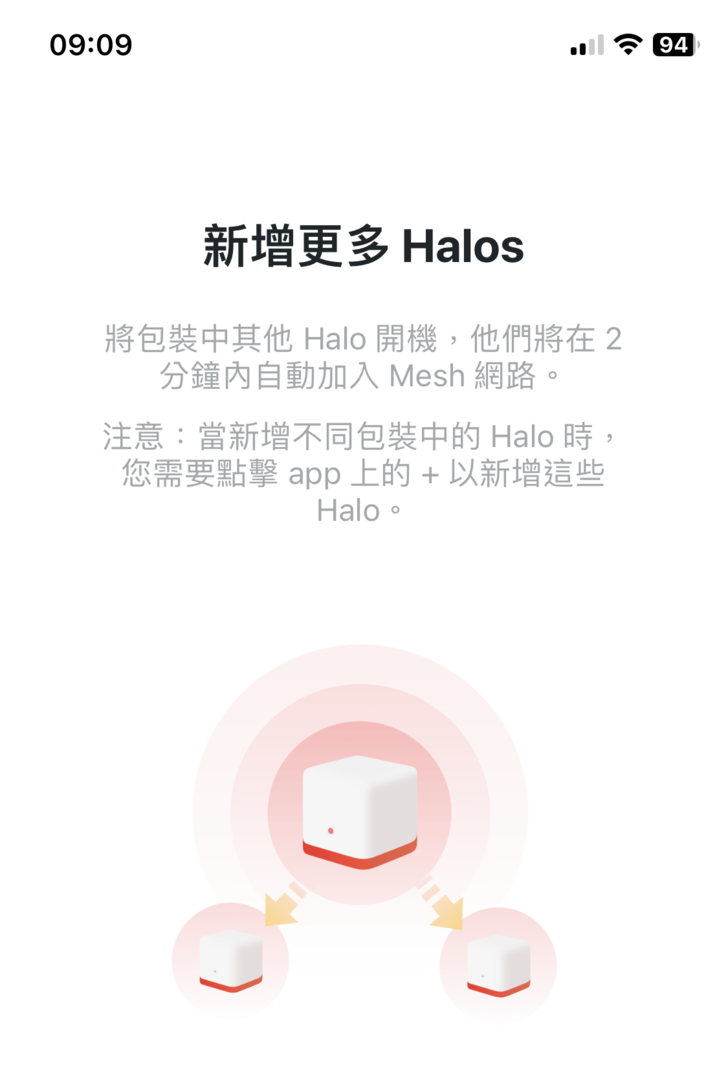 到目前無止其實就已完成分享器的設定,已經可以使用,但由於Halo H47BE是由兩台器所組成可高達180坪範圍的Mesh網路,所以這邊再來設定另一台H47BE,點選app右上方的+來新增機器,如下圖所示,MERCUSYS app之所以令我驚豔與讚賞的原因是,每個引導畫面都有簡短又明瞭的圖文說明,讓你很清楚在做什麼,也順便學到一些網路概念,簡短的說明不會讓你像在安裝其他app時,看到冗長的說明就懶得看直接下一步,這個部分是我覺得MERCUSYS網路在設計人機介面上很用心的地方。