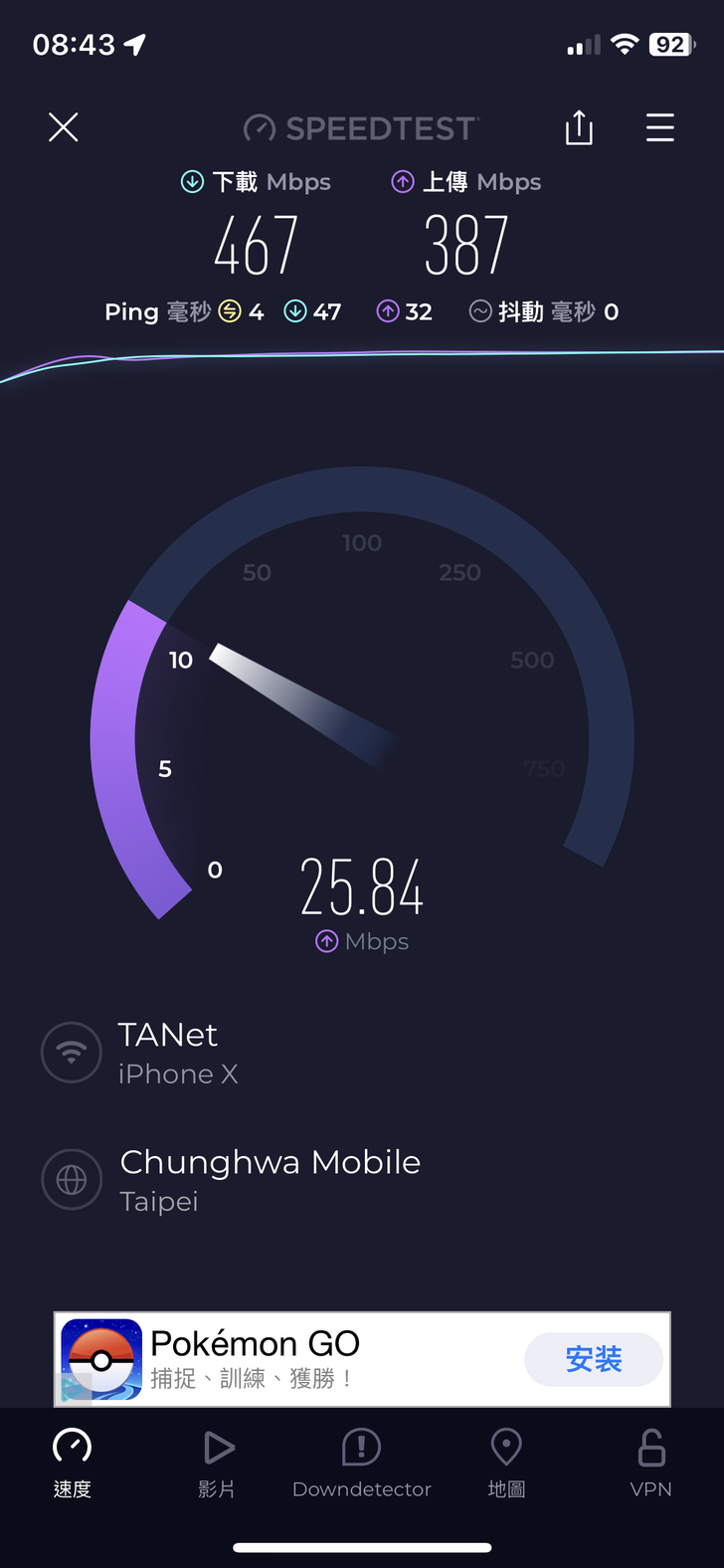 由MERCUSYS app可以看到這場連線人數為46人,網路狀況良好,下方會列出所有用戶端的裝置類型與連線的Wi-Fi網路,在測速軟體可以看到,以這樣人數不算少的情況下,速度來到飛快的下載467Mbps 上傳387Mbps