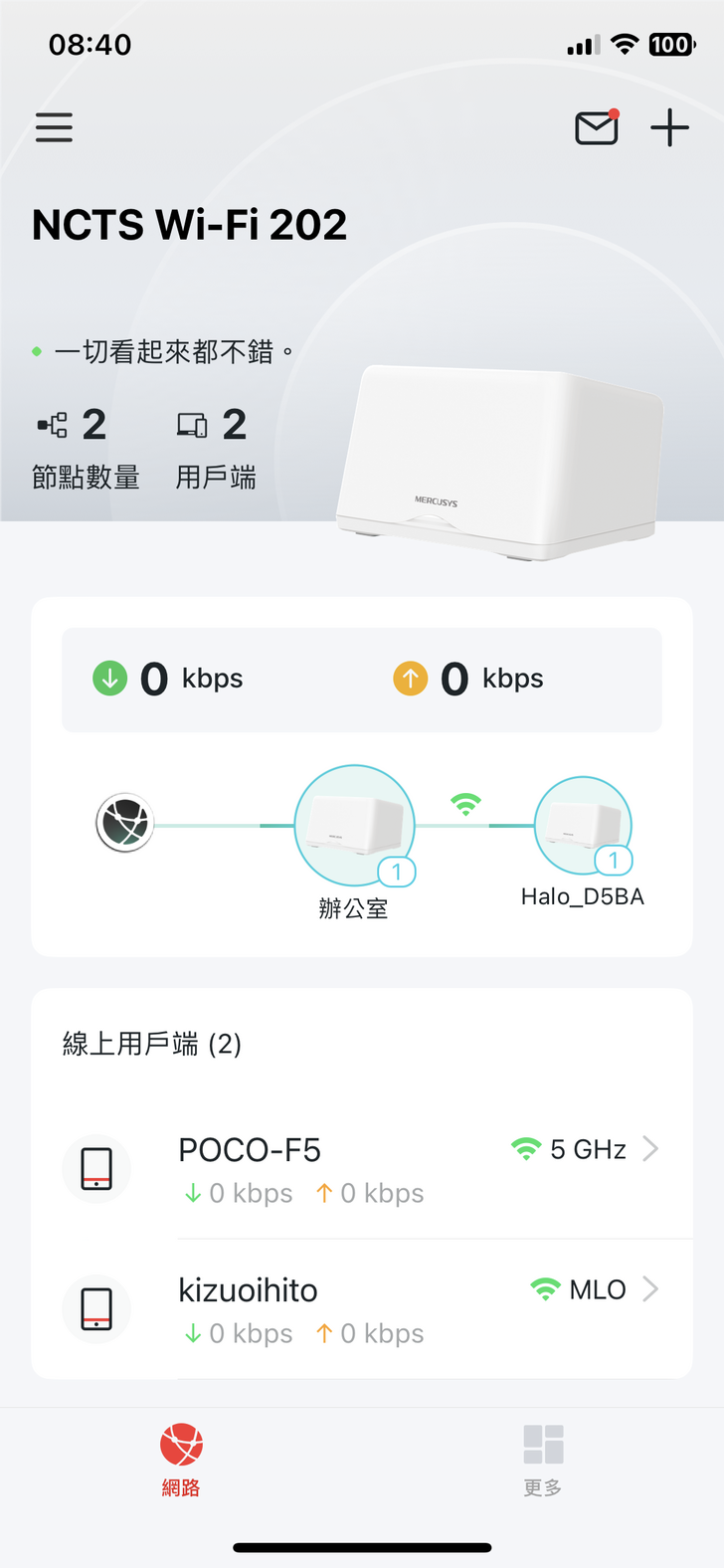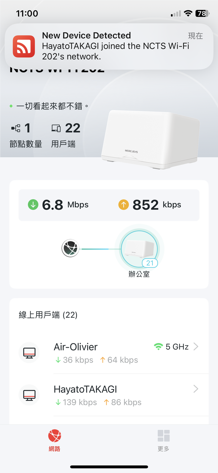 完成後MERCUSYS app的首頁會如下圖呈現目前狀態,這個首頁也設計得非常簡潔明瞭,平時一開啟app你就可以看到目前網路的狀態,那個環節有問題可以由圖示看出來去做排解,下方的用戶數更棒了,你可以看到目前連線使用的設備名稱就大概知道是誰在用,有沒有被盜連,這個部分以往其他家的分享器,通常要進去後台才看得到,且連線用戶通常只看得出是手機或電腦或是只顯示MAC address,讓你不大很清楚是哪些人在連,但MERCUSYS app 這樣的首頁顯示,雖然手機畫面不大,但已卻將比較需要看到的資訊的呈現給你,這點是非常令人安心與讚嘆的地方。