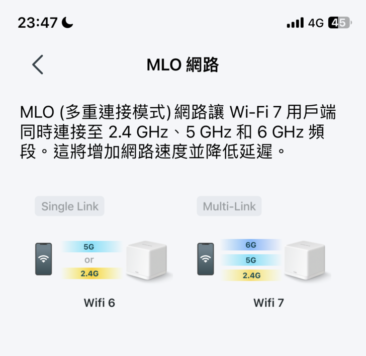 『Wi-Fi』與『訪客網路』都是用來設定Wi-Fi網路服務的,其中因為Wi-Fi 7多了最新的6GHz頻段,所以在Wi-Fi網路除了常見的2.4GHz、5GHz之外,多了可以新增6GHz的訊號服務,此外,這台H47BE最特別的是多了多鏈接操作MLO模式(Multi-Link Operation),它的目的在於提高吞吐量,減少延遲,提高程式的穩定性等,如下圖說明所示,MLO網路是結合2.4GHz、5GHz、6GHz跨三個頻段來發送與接收資料以達到上述的效果,實際測試的確是比其他頻道穩定與快速許多,在後面的測試會顯示實測效果。