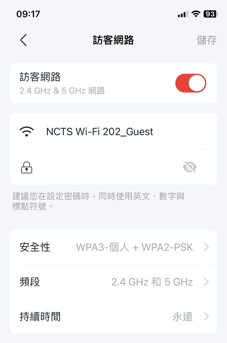其中訪客網路的用意是:如果你本來設定的Wi-Fi網路不想讓人知道,但又可能必須提供給訪客使用,這時候就可以透過訪客網路另外新增一個Wi-Fi網點讓訪客使用,如此一來就不需要提供自己慣用網路的密碼給對方使用,由下圖所示,新增『訪客網路』跟『Wi-Fi』網路一樣,可以選擇要提供2.4GHz和5GHz網路或是速度較快的6GHz網路頻段。