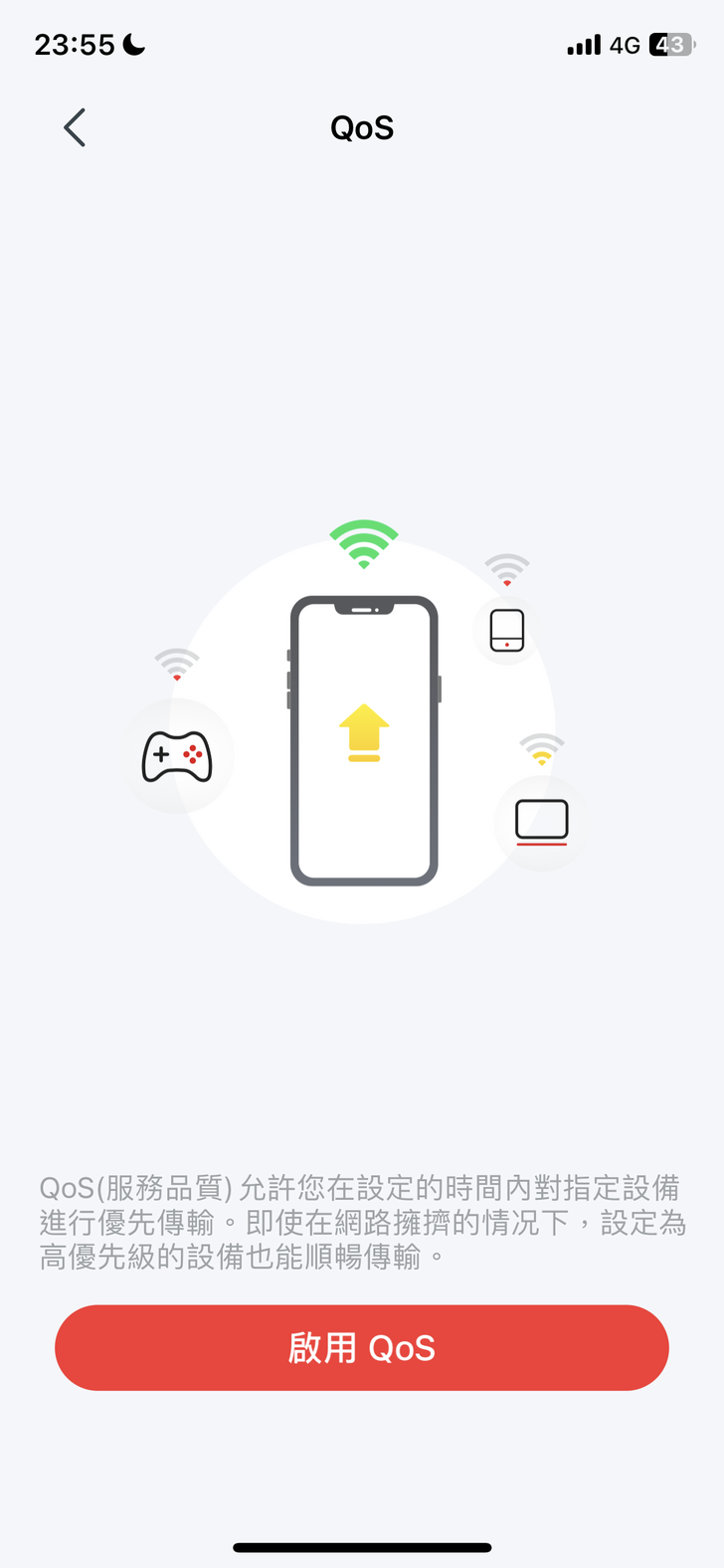 『Qos』 是服務品質(Quality of Service),簡單來說是要對指定的裝置設為網路優先傳輸,尤其實在多人使用環境下,如果有緊急優先工作與任務需要快速網路就可以設定QoS。